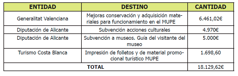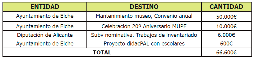 La Fundación Cidaris, como gestora del Museo Paleontológico de Elche (MUPE), recibe diferentes subvenciones nominativas y opta a subvenciones de libre concurrencia a lo largo del año.