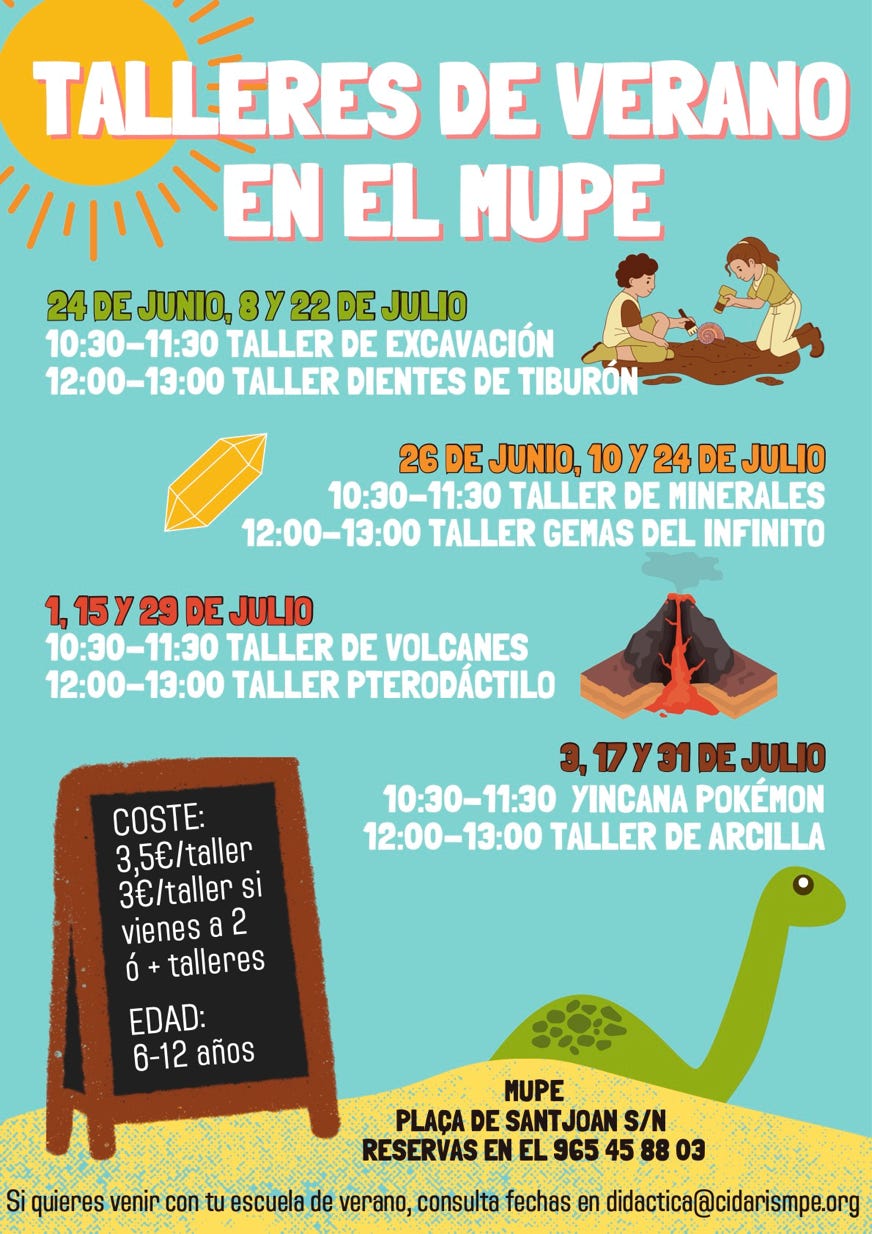 Con esta propuesta los participantes descubrirán el mundo de los dinosaurios, los fósiles, minerales o los volcanes de una manera divertida, mediante la realización de talleres y actividades en el espacio museístico ilicitano. Este año como novedad, se podrán realizar hasta dos talleres diarios.